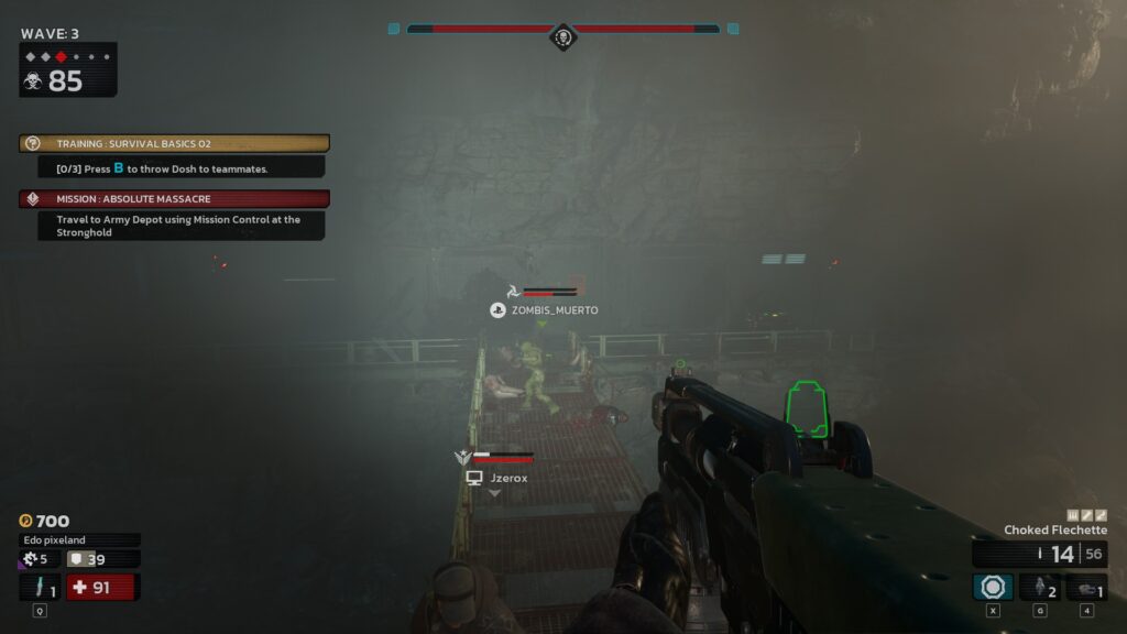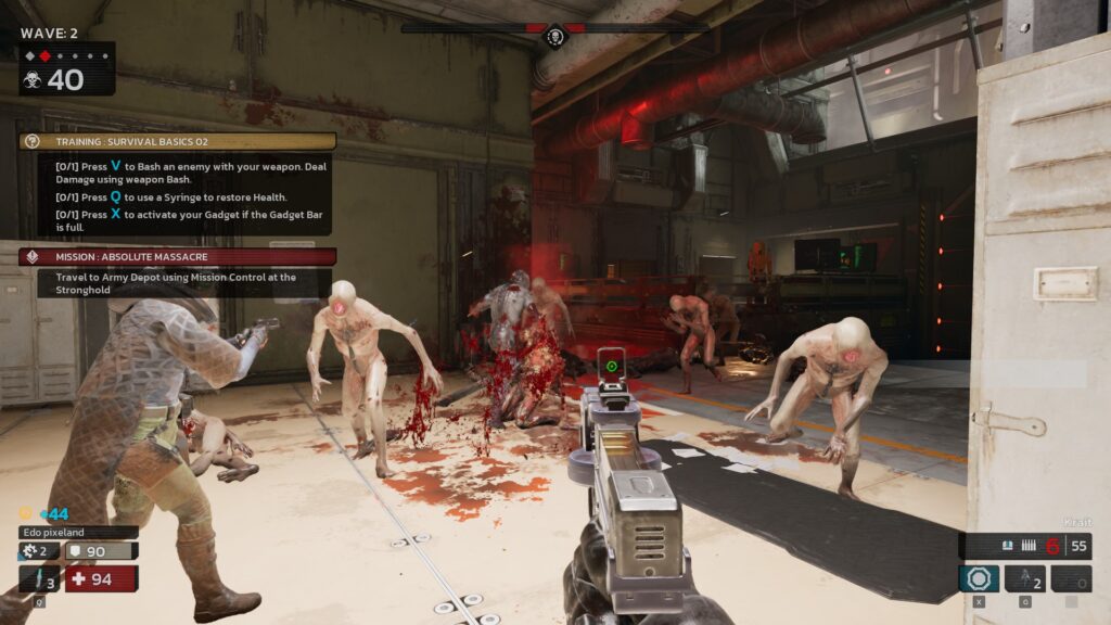 La afinidad del juego será pasar fases u oleadas de monstruos cada vez más difíciles, vendrán asechadores que te llenarán la cara de golpes, criaturas horripilantes y obesas que escupen ácido, arañas mutantes. Cada vez que finalicemos una oleada se nos recompensará  con dinero y al final de esta se abrirá un panel interactivo donde se pueden comprar nuevas y más letales armas, están varían en su eficacia y costo, según su color, pasando de las blancas al ser las mas comunes, verdes especiales, azules y violetas únicas.